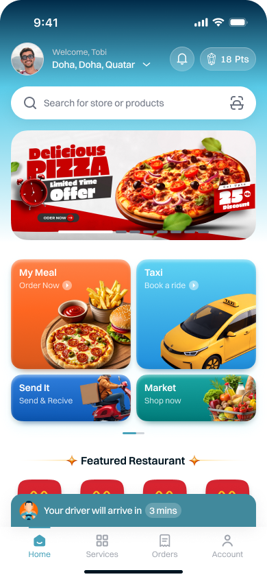 Order food, book a taxi, or shop your favourite market — all from one beautifully simple app.